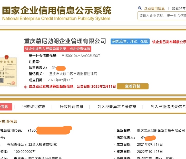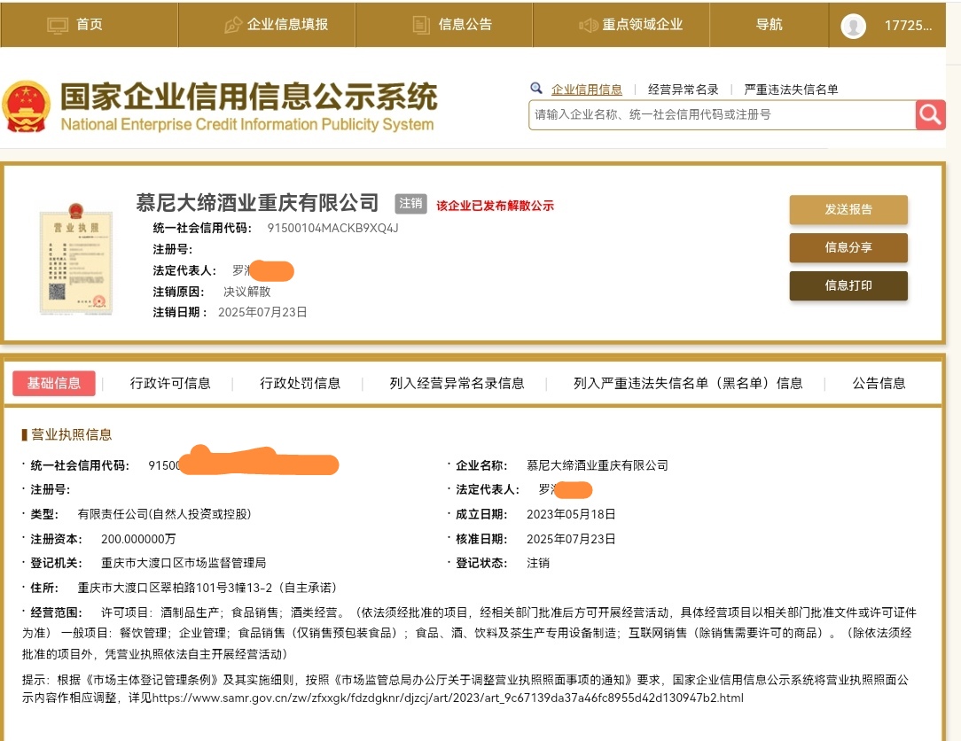 国家企业信用信息公示系统网站显示,慕尼大缔酒业重庆有限公司于7月23日注销。而重庆慕尼勃朗企业管理有限公司也已发布解散公示,并于7月因未依照《企业信息公示暂行条例》规定的期限公示年度报告,被主管部门列入经营异常名录。