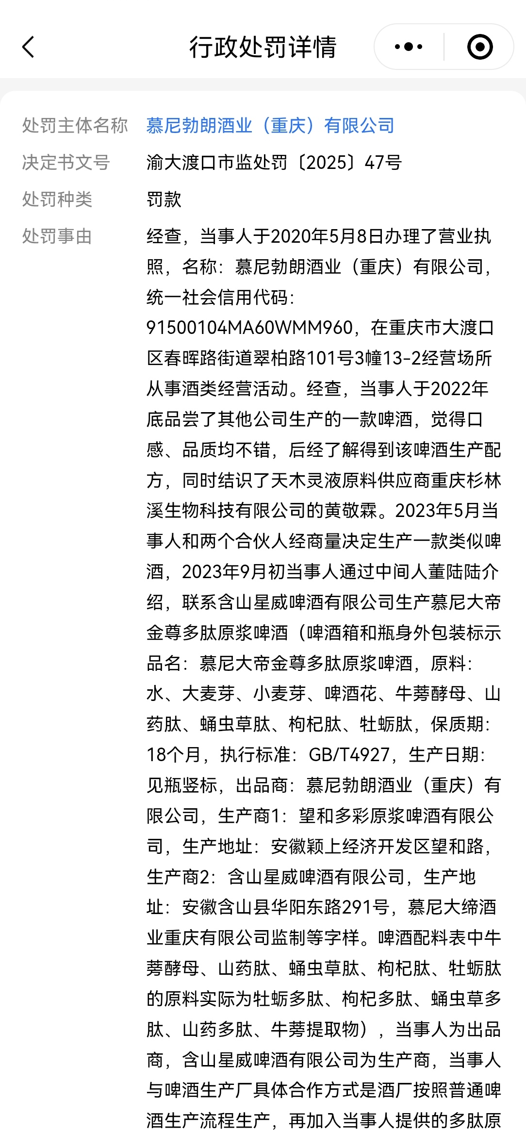 处罚事由显示,2022年底,重庆慕尼勃朗品尝了其他公司生产的一款啤酒,觉得口感、品质均不错。之后,该企业得到该款啤酒的生产配方,同时结识了天木灵液原料供应商重庆杉林溪生物科技有限公司的黄某。