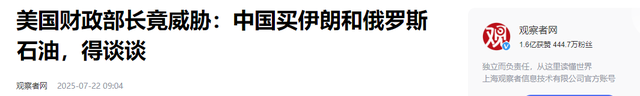 观察者网-美国财政部长竟威胁:中国买伊朗和俄罗斯石油,得谈谈
