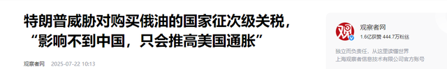 观察者网-特朗普威胁对购买俄油的国家征次级关税,“影响不到中国,只会推高美国通胀”